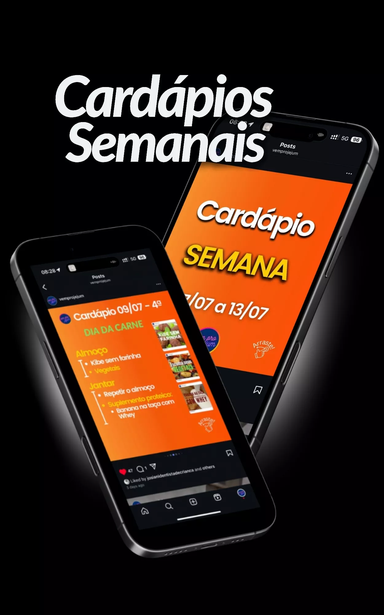 Um cardápio semanal novo todo domingo no FEED do Instagram, com receitas selecionadas do Vemprojejum. Além dos pratos tradicionais já consagrados, novas receitas são adicionadas todo mês e você tem tudo ali, na palma da sua mão!