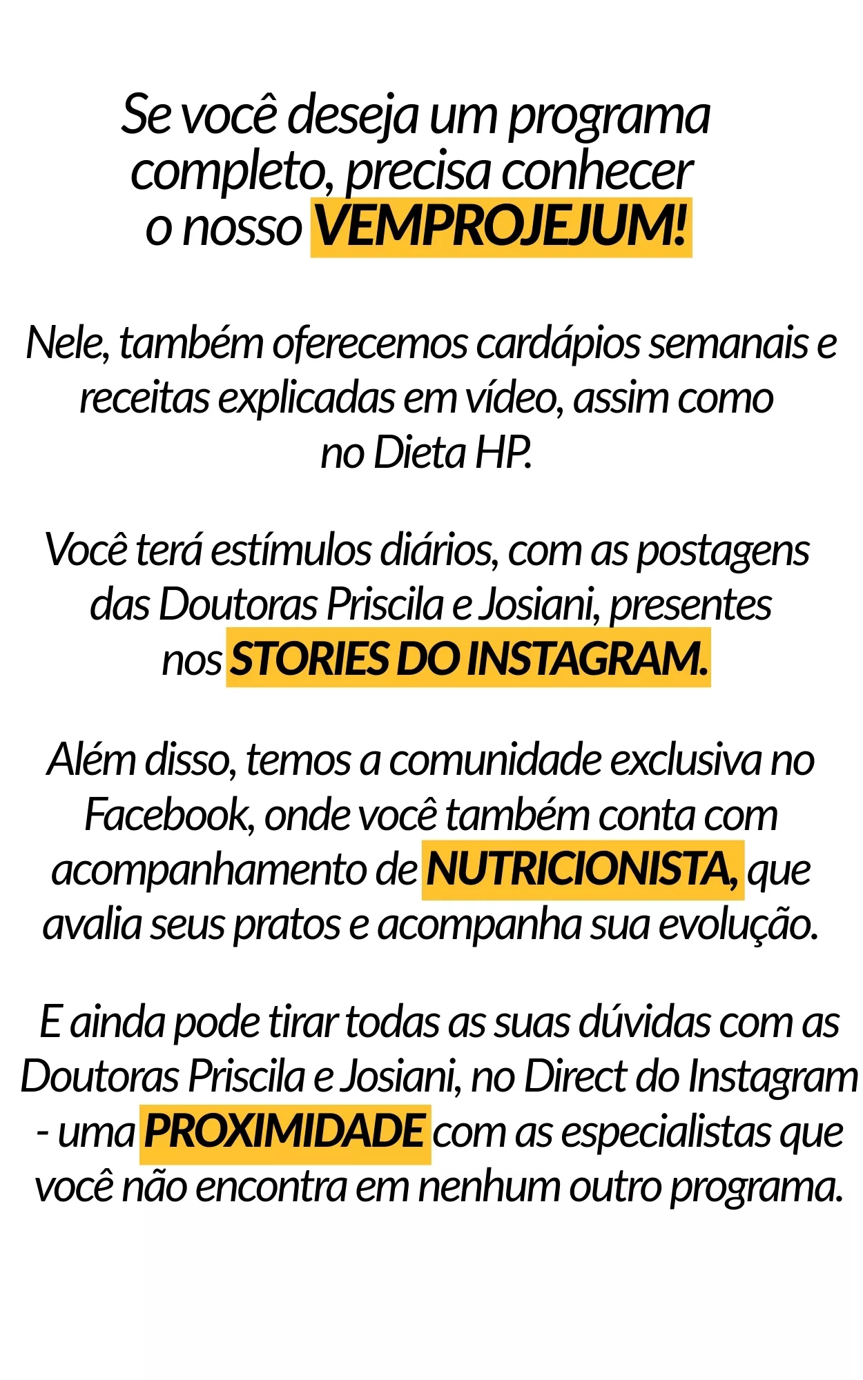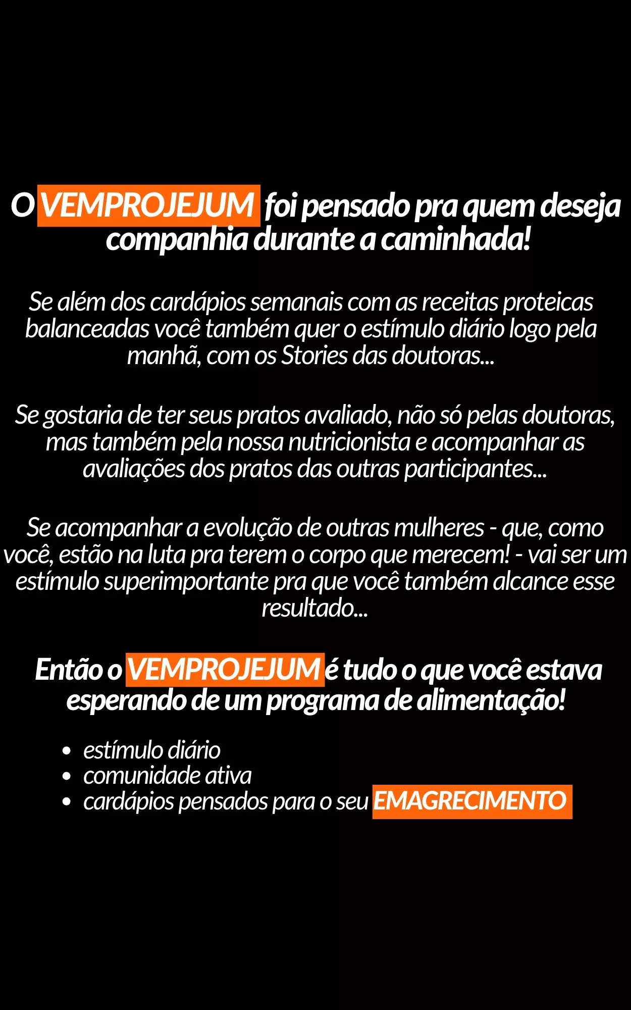 No Vemprojejum, você tem acesso direto às Doutoras no Direct do Instagram e, na Comunidade privada, pode conversar com as outras participantes e também esclarrecer suas dúvidas com as Doutoras e com a nossa nutricionista.