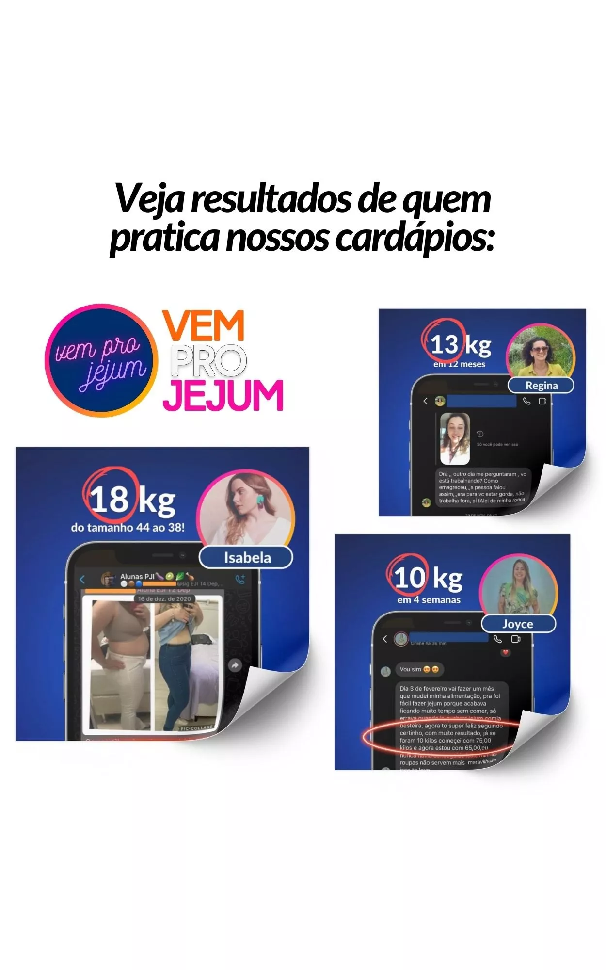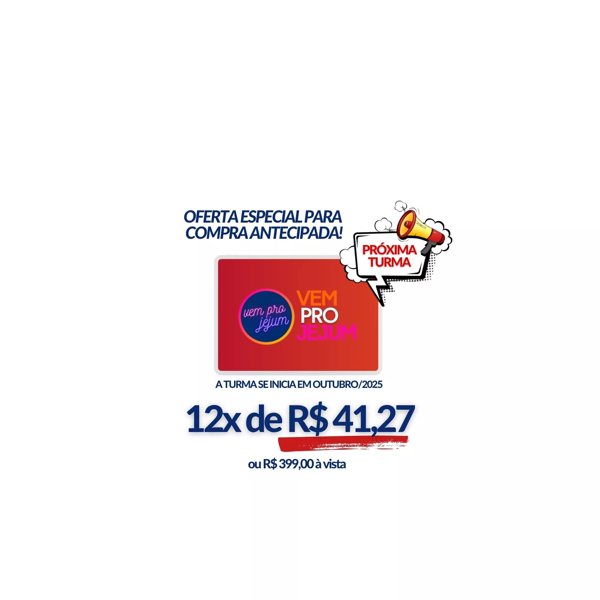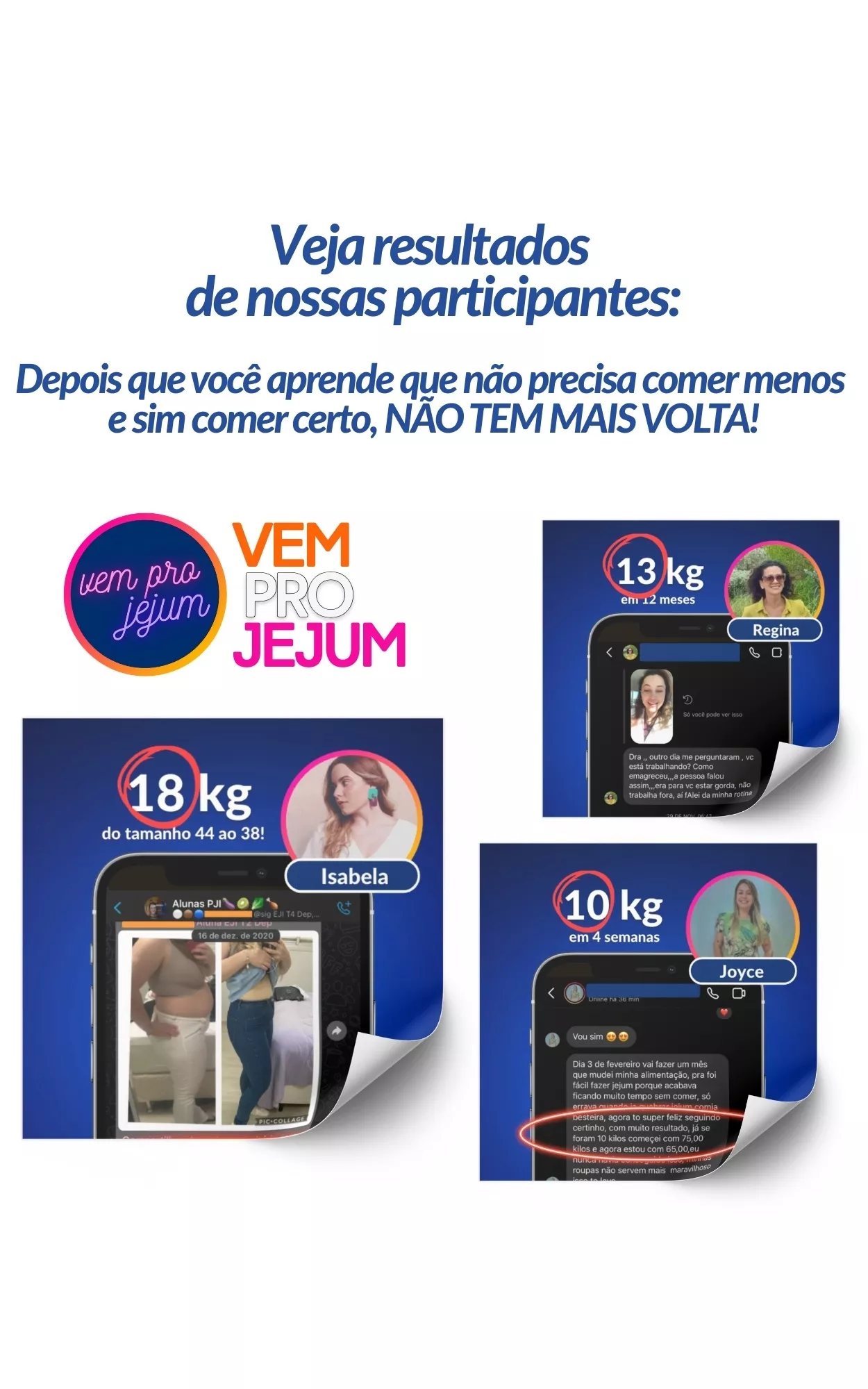 O VEMPROJEJUM é um passo a passo para quem precisa se alimentar bem. Nele você encontra os 3 pilares do método AJT, fundamentados em: 1) conhecer quais os alimentos que mais te ajudam a não exagerar nas calorias; 2) saber qual é a melhor estratégia para programar suas refeições e 3) estar em comunidade, em uma "Tribo" onde todas querem um vida mais saudável com alimentação de qualidade! É, ainda, um guia prático para começar a realizar o jejum intermitente, se você desejar fazê-lo!