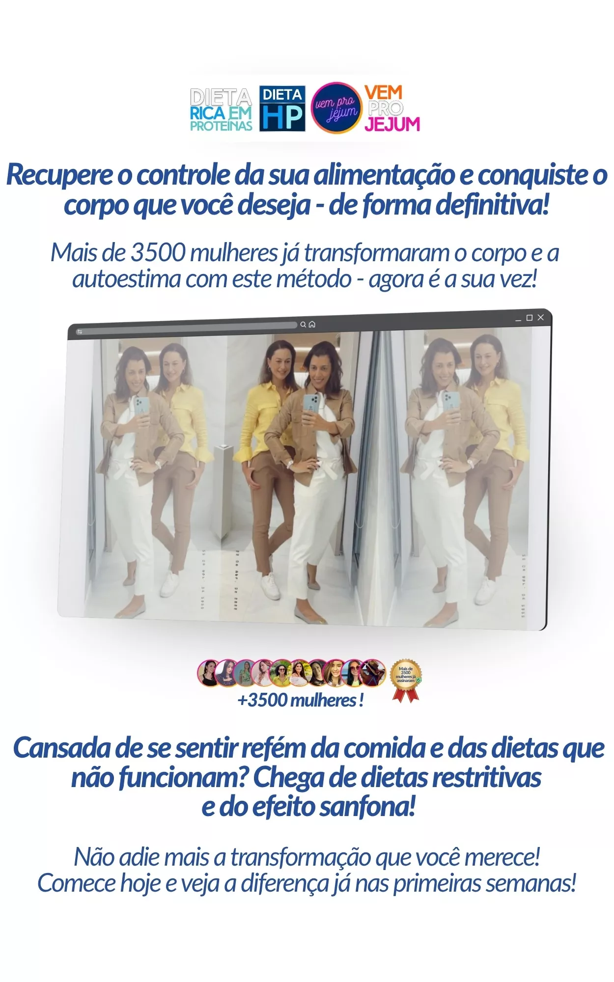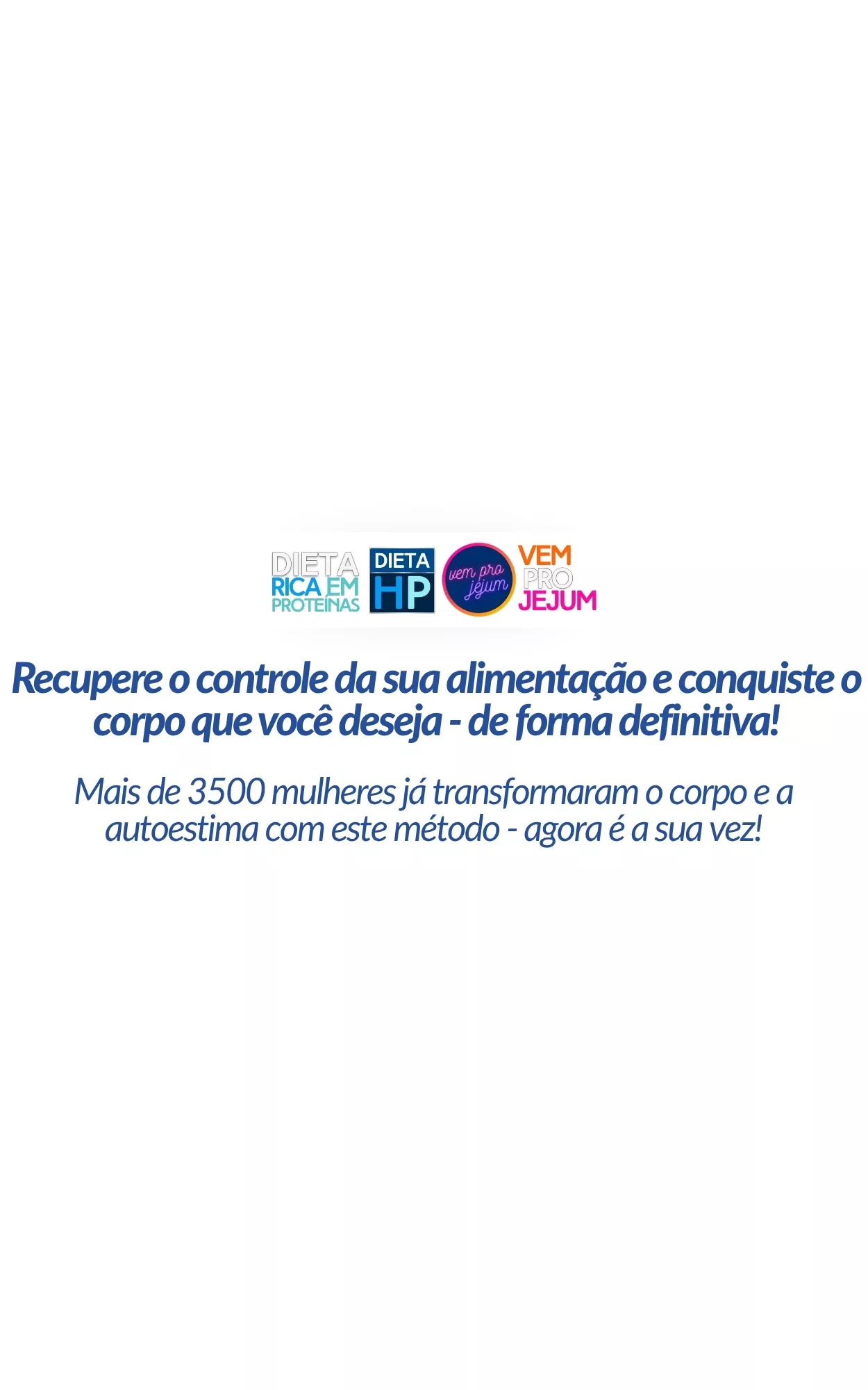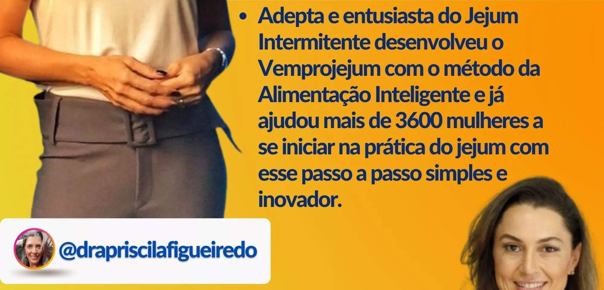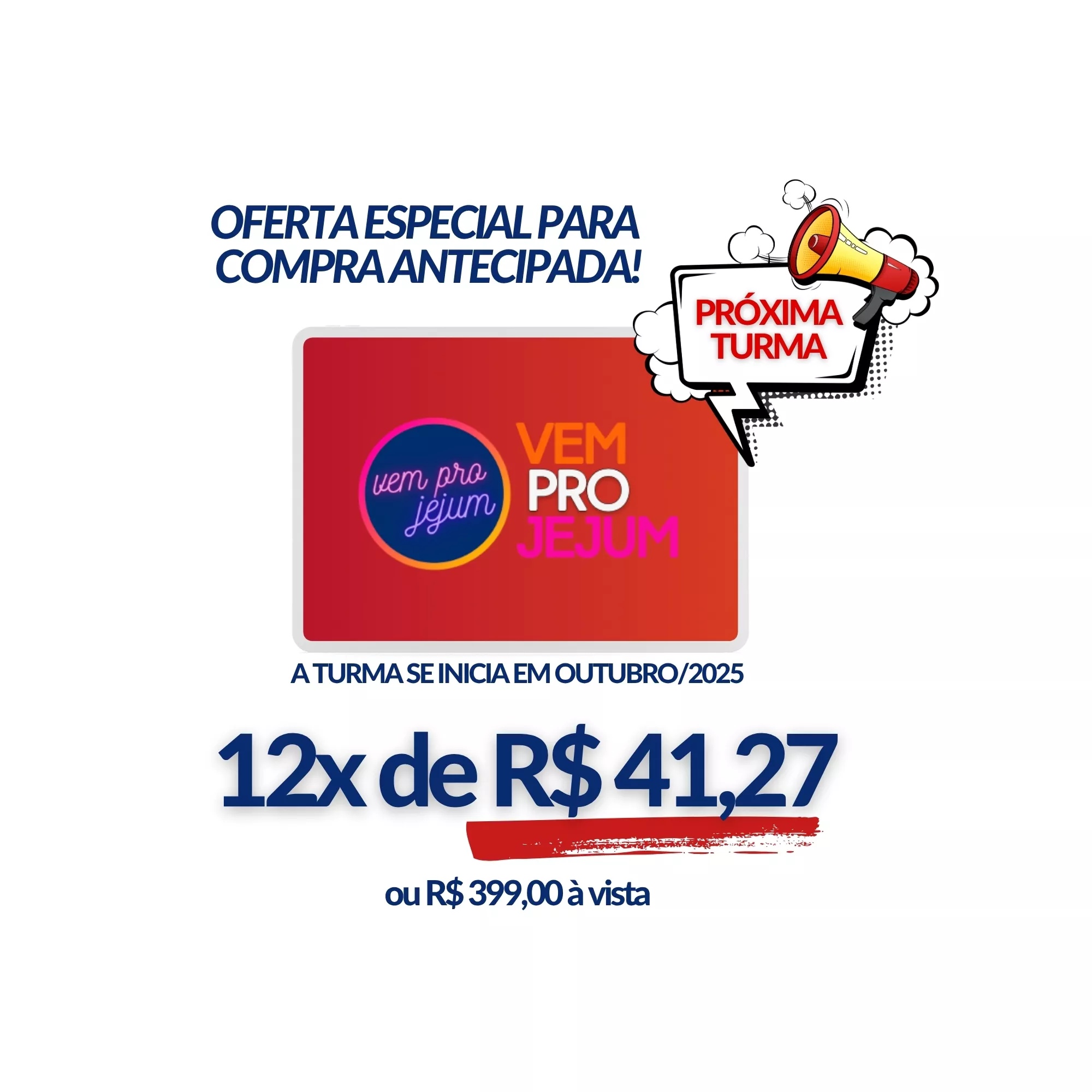 O VEMPROJEJUM é um passo a passo para quem precisa se alimentar bem. Nele você encontra os 3 pilares do método AJT, fundamentados em: 1) conhecer quais os alimentos que mais te ajudam a não exagerar nas calorias; 2) saber qual é a melhor estratégia para programar suas refeições e 3) estar em comunidade, em uma "Tribo" onde todas querem um vida mais saudável com alimentação de qualidade! É, ainda, um guia prático para começar a realizar o jejum intermitente, se você desejar fazê-lo!