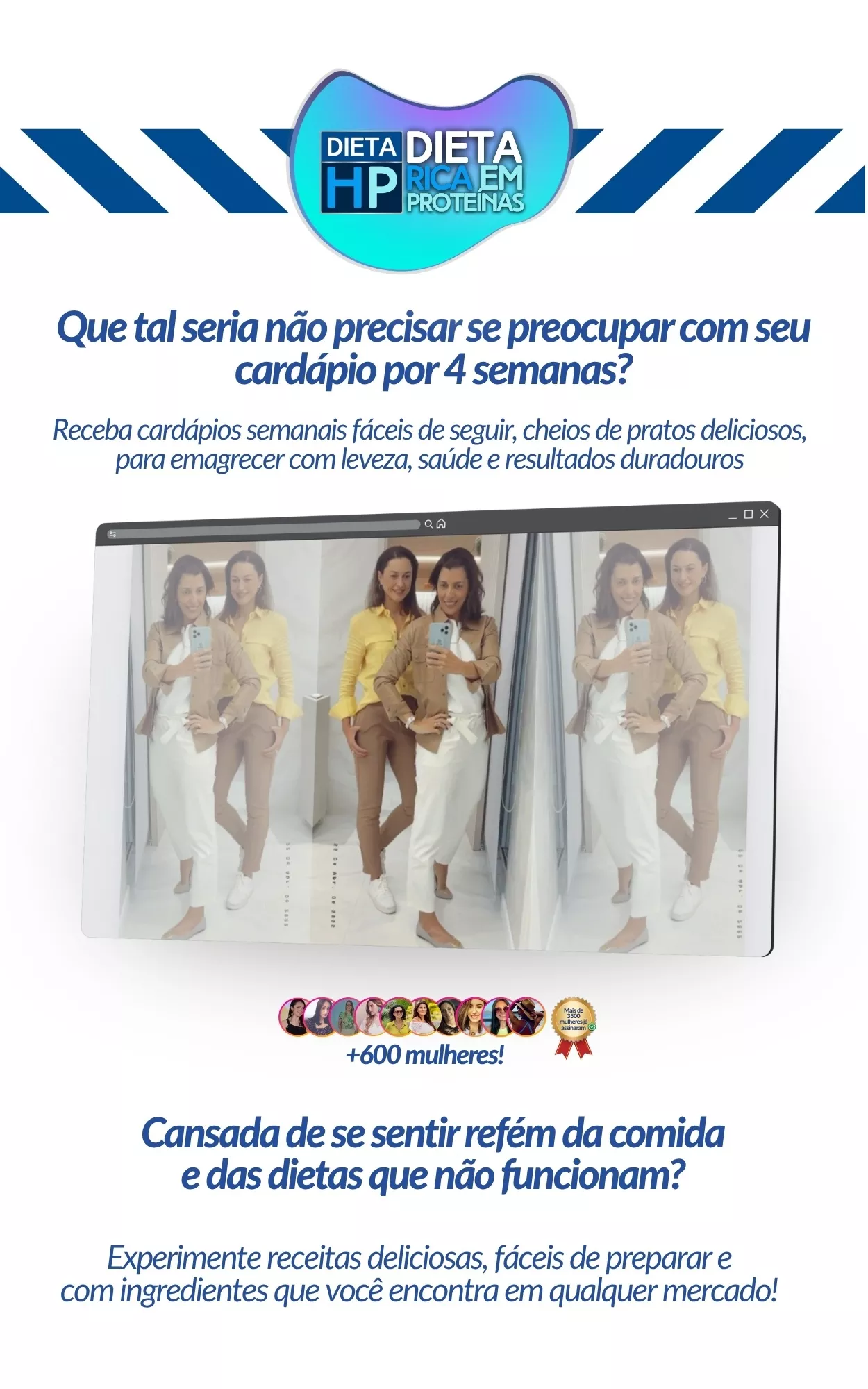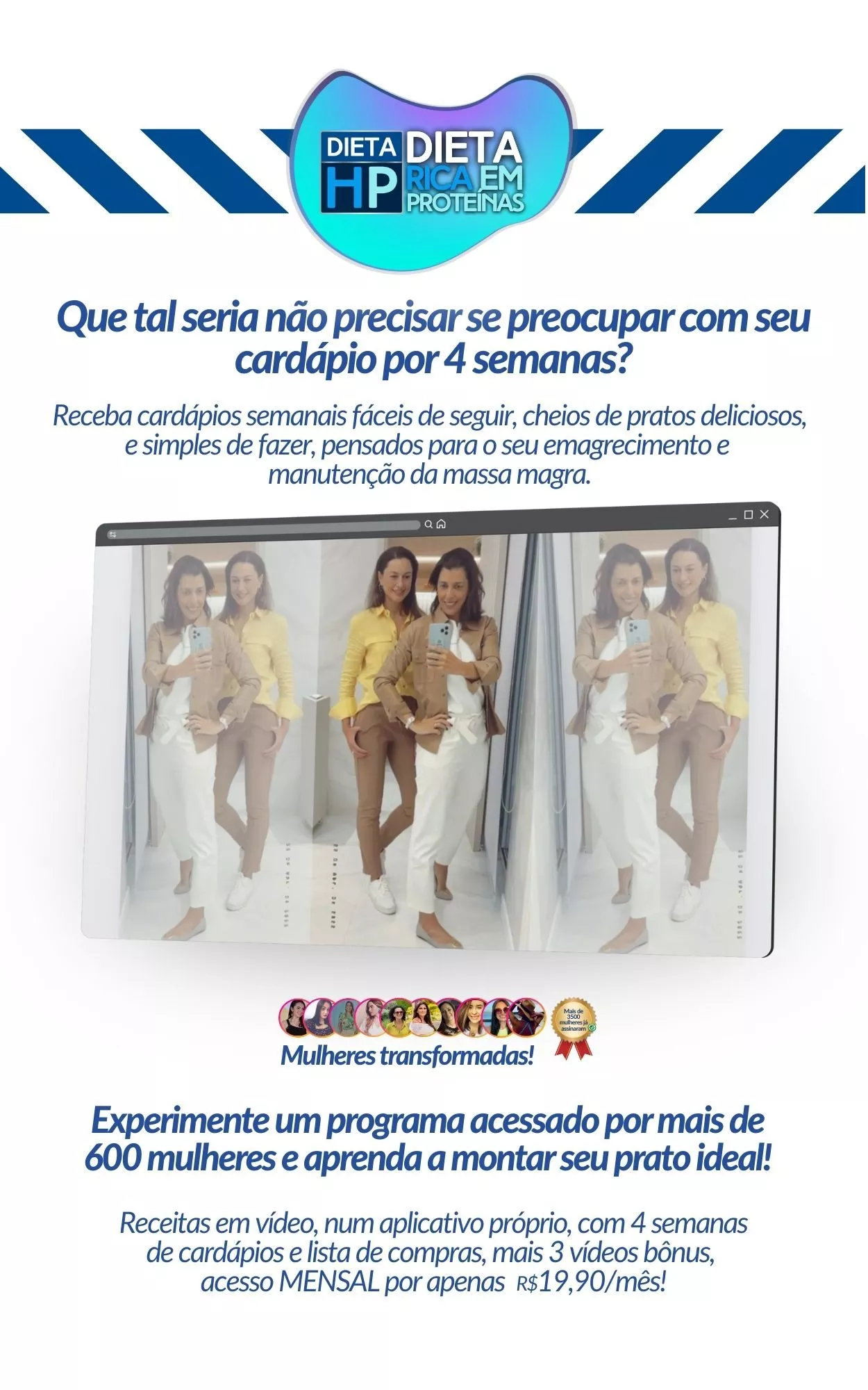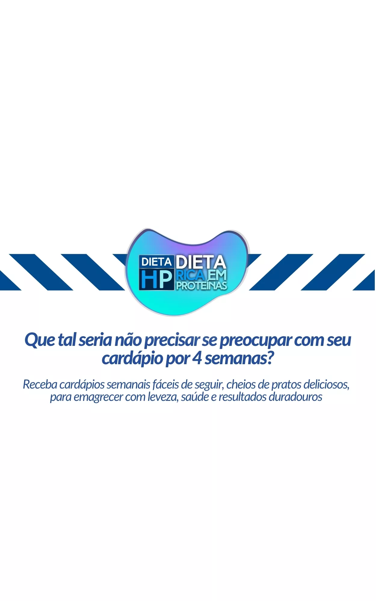 No Dieta HP, você terá um cardápio semanal com sugestões diárias de pratos principais e reforços proteicos.