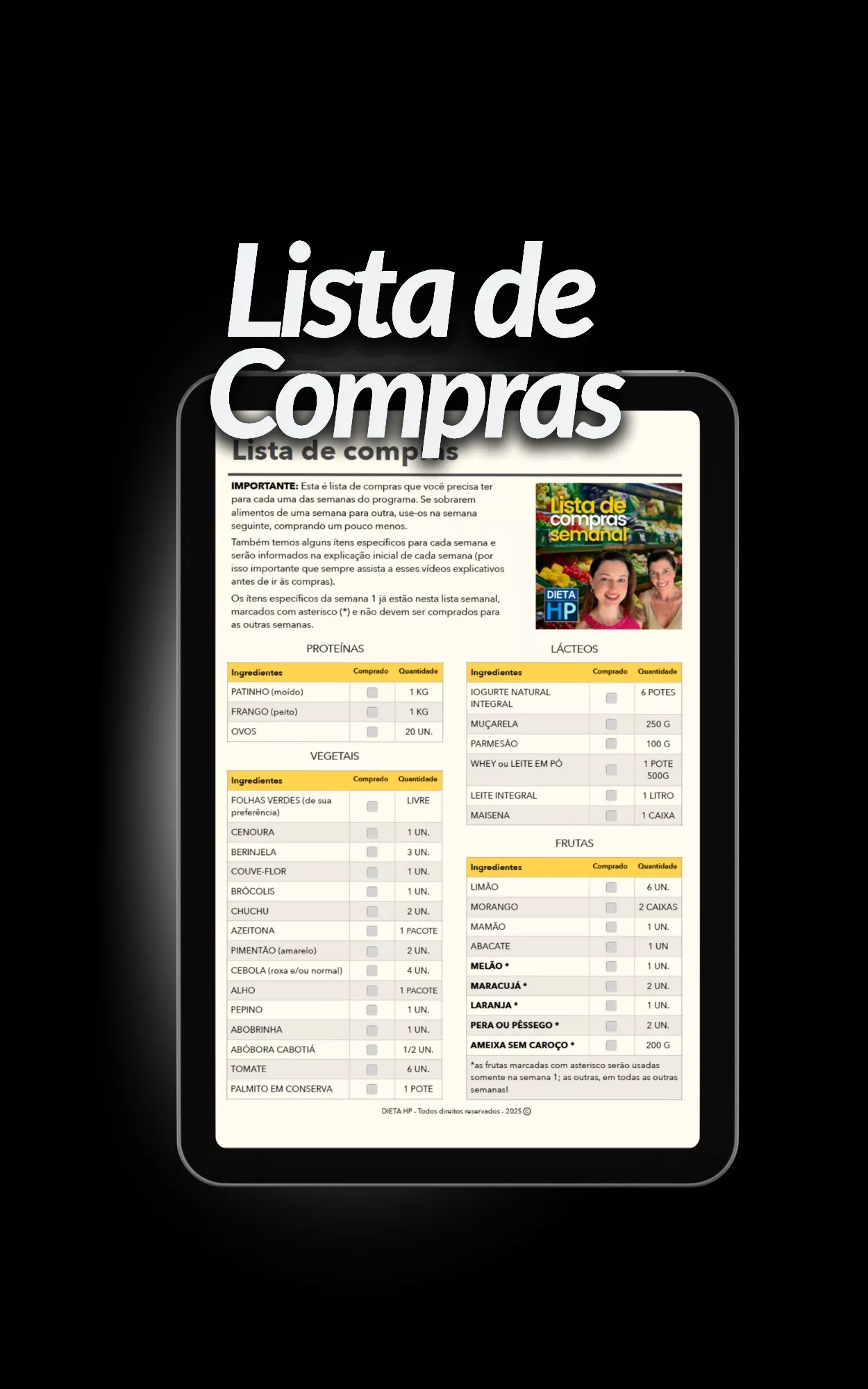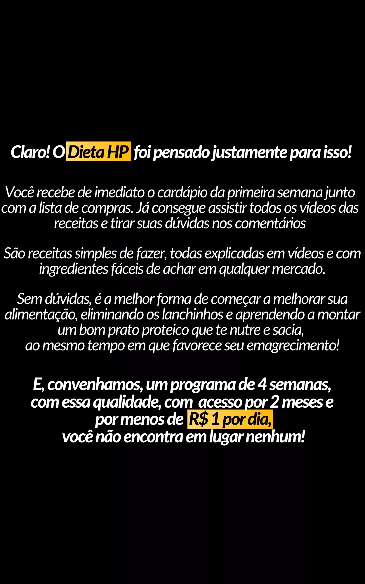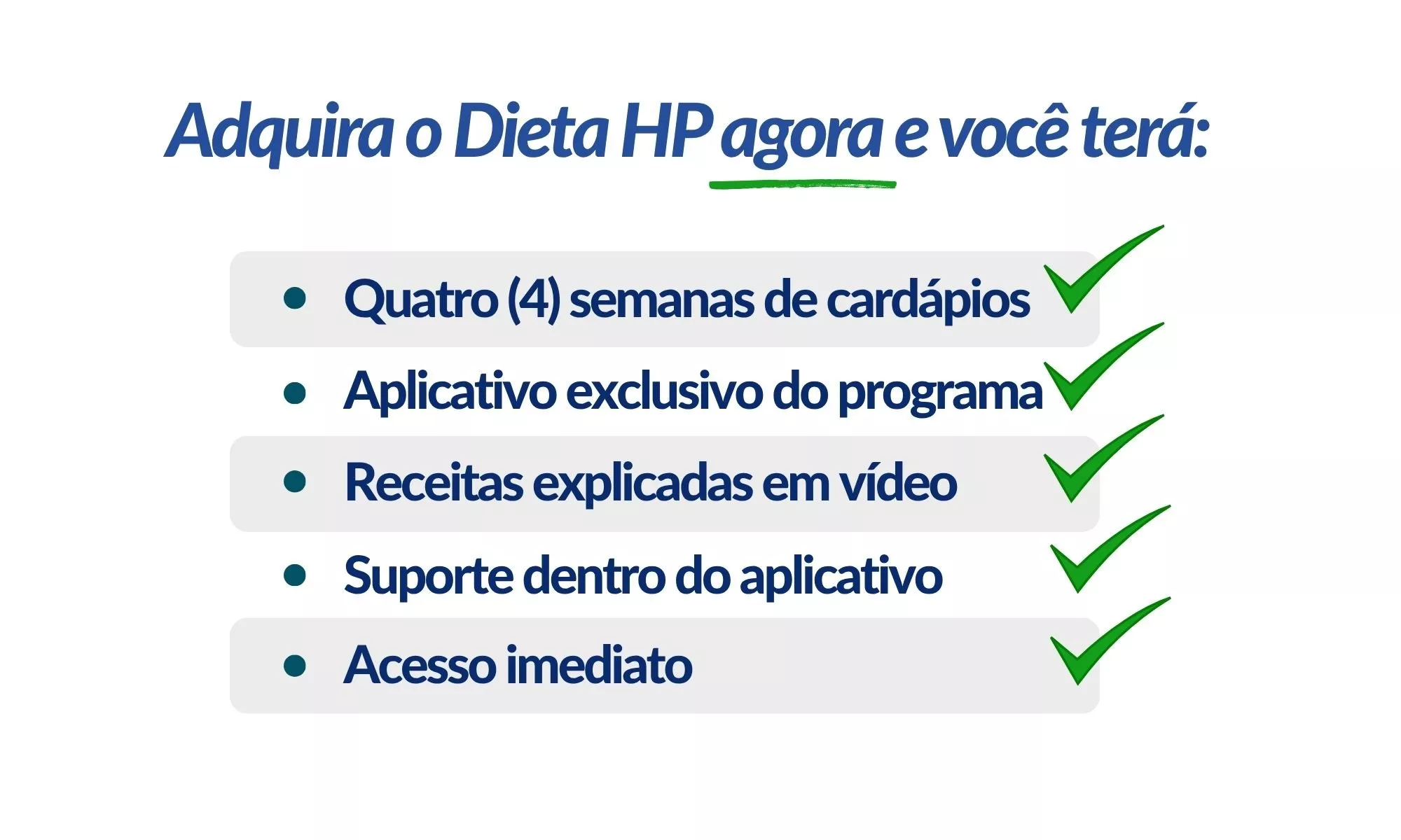 No Dieta HP, os cardápios são semanais. Você tem acesso a tudo desde o momento da aquisição peloprazo de 2 meses. Nesse intervalo, pode fazer quando desejar. Quanto antes começar, mais rápido devem vir seus resultados!