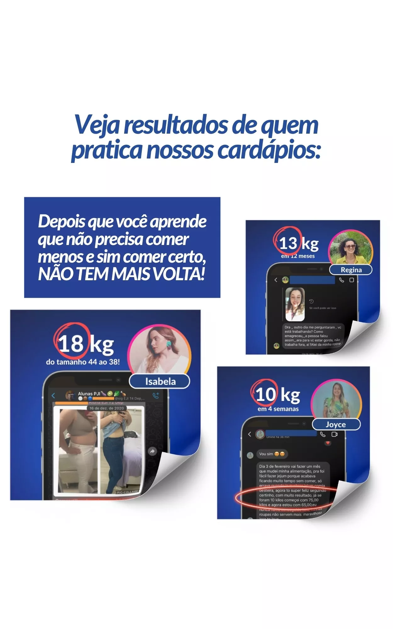 Enfatizamos sempre que nossos programas são pensados em muito mais do que o emagrecimento. A perda de peso com a boa alimentação é consequência direta de uma boa estratégia alimentar. Há participantes que experimentam perdas maiores e mais rápidas, mas há grande influência de quantos quilos você está acima do peso atualmente.